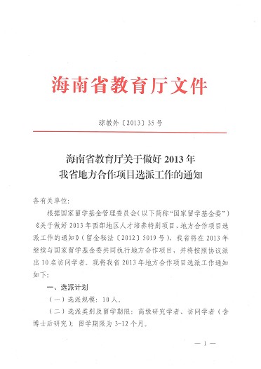 海南省教育厅关于做好2013年我省地方合作项目选派工作的通知